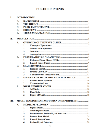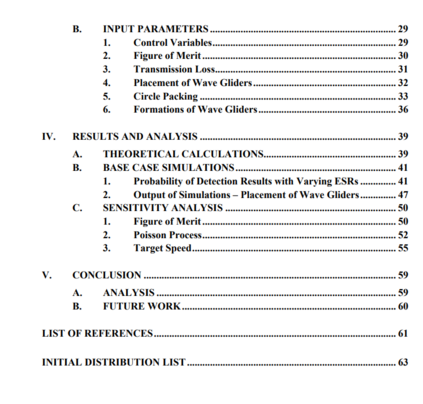 在购置海军平台的资本有限的限制下,需要应对海上挑战。像波浪滑翔机这样的无人平台可能有助于解决这个问题。波浪滑翔机是一种无人水下航行器,它可以配备一个被动阵列,并可以在感兴趣的区域(AOI)保持长时间的部署。它们能够提供分层防御,防止对手在不被发现的情况下穿越该区域,从而提供低成本、持久性的反潜战(ASW)解决方案。在2016年由英国皇家海军领导的 "无人勇士 "演习中,展示了反潜波浪滑翔机成功追踪一艘载人潜艇的能力。然而,如何部署一定数量的波浪滑翔机来探测一艘过境的对手潜艇的问题仍然相对没有被探索。本论文旨在开发一个模型,以确定部署的波浪滑翔机的探测能力,该模型考虑了与探测水下接触有关的变量,在具有声学挑战性的水下环境中使用被动声纳,并在部署无人资产方面受到限制。该模型规定了实现特定探测概率所需的波浪滑翔机的最佳数量,并为其在AOI中的位置提供了参考,以尽量减少对手潜艇穿越该区域而不被发现的概率。