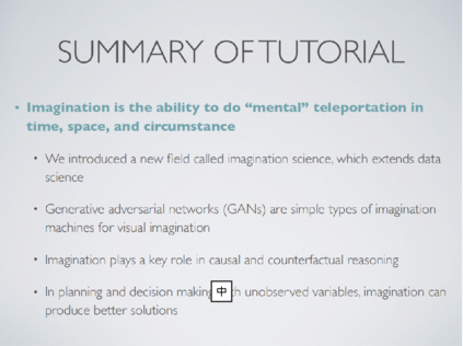 本教程介绍了一个新的领域的研究称为想象科学在人工智能和计算机。与数据科学相反,想象力科学构建了经验的统计总结并回答了“什么是”这个问题,它探索了更广泛的问题,包括介入性问题如“如果”、反事实查询和“为什么”解释。从数字营销到面向社会公益的人工智能,一系列具有挑战性的现实问题都涉及想象力科学。本教程将描述人工智能领域的一系列趋同研究,这些研究可以被视为构建想象机器的早期尝试,范围从生成对抗网络到结合观察、干预和反事实推理的分层因果架构。本教程将讨论几个新的研究方向,包括使用想象模型建模顺序决策的新方法,以及试图整合因果知识和想象模型的新想法,如GANs。本教程还将涵盖超越常规方法(如梯度下降法)的数学形式主义,以训练想象力机器,建立在经济学、心理学和认知科学的思想之上。本教程还将探索对想象力的研究将如何为下一代“如果”高保真模拟引擎带来新的架构,这将取代今天的“是什么”搜索引擎,并带来构建下一代全球网络的新方法。