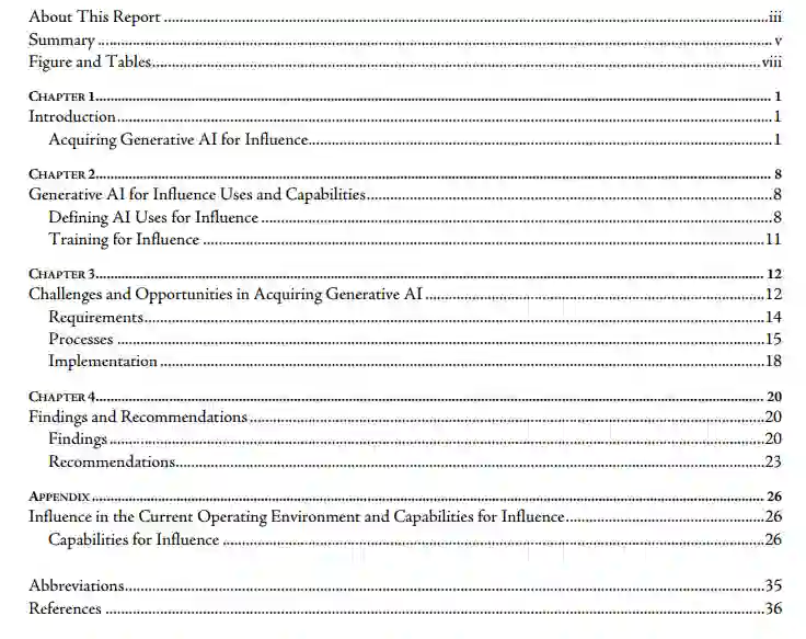本报告作者系统审查美国防部现有生成式AI采购举措(聚焦影响力活动领域),访谈来自国防部、私营部门及政府研究机构的18位领域专家以明确部队需求与商用AI能力,并召集24名国防部各影响力组织代表参与专家研讨会,厘清其生成式AI相关作战与战术需求。基于此分析,作者就如何经济高效地获取与开发技术以利用当前及新兴能力提出建议。