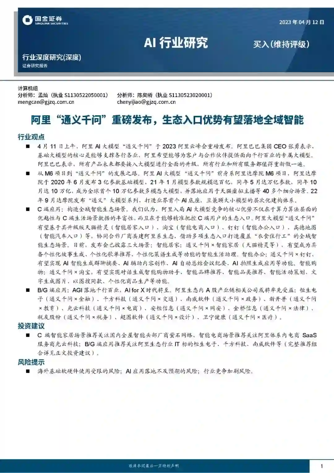 B/G端应用:AGI落地千行百业,AIforX时代将至。阿里生态内A股产业链相关公司或将率先受益:恒生电子(通义千问×金融)、千方科技(通义千问×交通)、南威软件(通义千问×政务)、新开普(通义千问×教育)、光云科技(通义千问×电商)、安恒信息(通义千问×网安)、金桥信息(通义千问×法律)、税友股份(通义千问×税务)、超图软件(通义千问×设计)、卫宁健康(通义千问×医疗)。