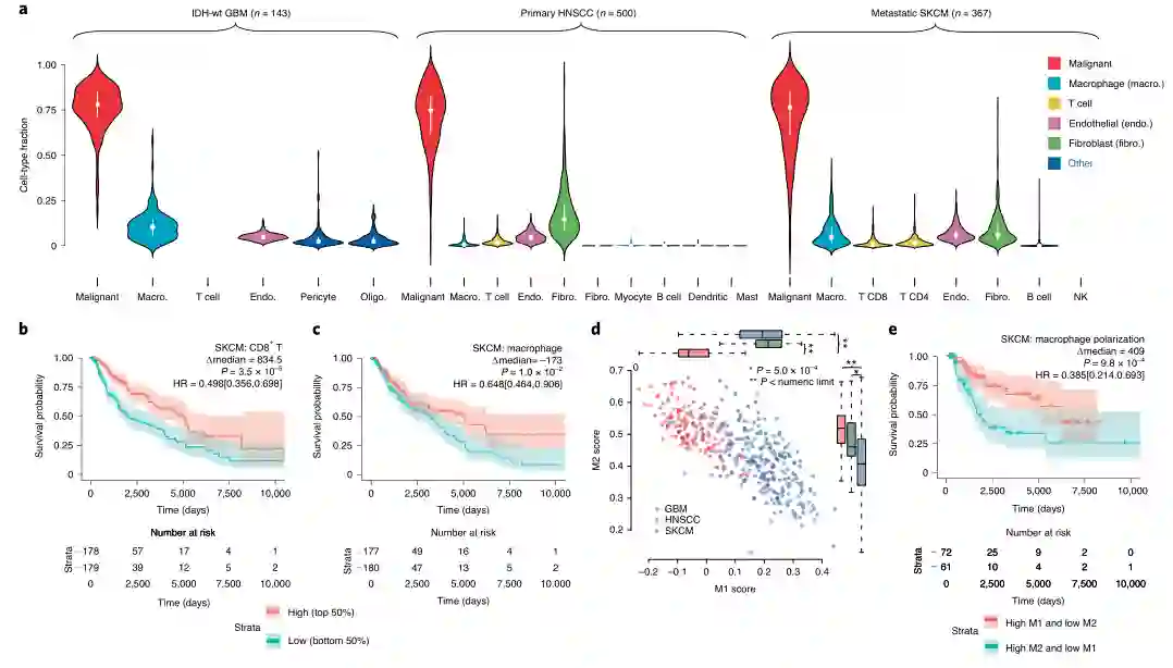 浸润性免疫细胞类型和状态对生存的影响。 作者分析了来自三种肿瘤类型GBM、HNSCC和SKCM16-18的1142份肿瘤基因组图谱(TCGA)样本的细胞类型比例。为了保持尽可能高的准确性,作者在每个去卷积任务中使用了来自相同肿瘤类型的scRNA-seq参考。利用这些参考数据集,提供了6种GBM细胞类型的估计,10种HNSCC细胞类型,8种SKCM细胞类型(图2a)。作者发现CD8+ T细胞与生存有更强的相关性,与以往报告一致。在HNSCC中,T细胞比例也与更好的临床结果相关,但仅在将细胞类型丰度作为连续变量处理的模型中,效果显著(P = 0.001, Wald检验) (图2b)。图2c表明BayesPrism估计的巨噬细胞与SKCM患者的生存呈正相关(P = 0.01, log-rank检验)。作者使用BayesPrism来评估含有5%巨噬细胞的样本中巨噬细胞特异性基因的表达。作者比较了巨噬细胞表达与两个巨噬细胞亚群特征的标记基因M1和M2,这两个亚群被认为在TME中有不同的作用。来自GBM的巨噬细胞M2评分最高,M1评分最低,而来自SKCM的巨噬细胞M2评分最低,M1评分与来自HNSCC的巨噬细胞相当(图2d)。在SKCM中,巨噬细胞极化与生存率有极强的相关性(图2e)。