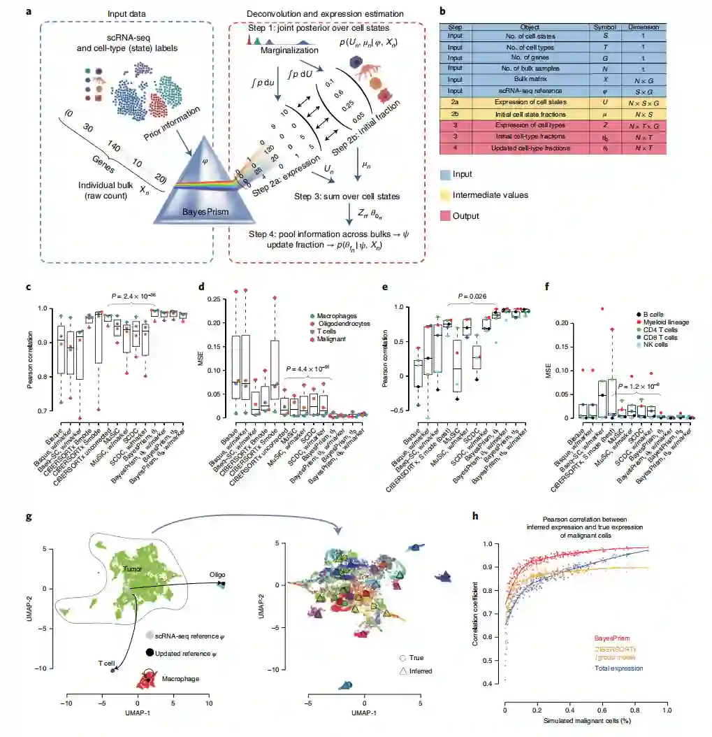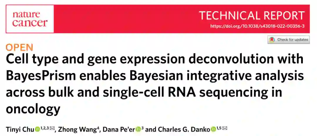 编译 | 杨博,王自乐 审稿 | 王海云 本文介绍美国纽约州伊萨卡康奈尔大学兽医学院贝克动物健康研究所Tinyi Chu和美国纽约州伊萨卡市康奈尔大学兽医学院生物医学系Charles G. Danko共同通讯发表在 Nature cancer 的研究成果:作者开发了贝叶斯细胞比例重构,使用统计边缘化推断(BayesPrism),一种贝叶斯方法,使用来源于患者的scRNA-seq作为先验信息,从bulk RNA-seq中预测单个细胞类型的细胞组成和基因表达。对原发性胶质母细胞瘤、头颈部鳞状细胞癌和皮肤黑色素瘤进行了整合分析,以将细胞类型组成与不同肿瘤类型的临床结果相关联,并探索恶性和非恶性细胞状态的空间异质性。作者使用排除混杂的非恶性细胞后的基因表达注释来细化当前的癌症亚型。最后确定了恶性细胞中与多种肿瘤类型的巨噬细胞浸润、T细胞、成纤维细胞和内皮细胞相关的基因表达。并且引入了一种新的视角,可以在bulk RNA-seq数据中准确地推断细胞组成和表达。