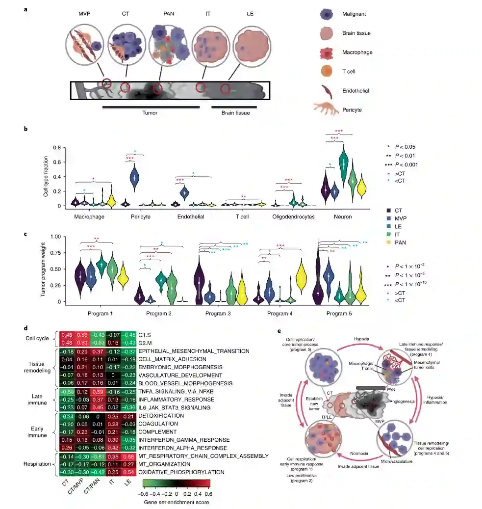 GBM基因程序和细胞类型的空间异质性 本文假设恶性细胞中基因程序的激活与微环境中非恶性细胞类型的比例之间的关系可以显示出肿瘤内的空间异质性。实验使用IVY GAP将122个RNA-seq样本分离成五个结构:前缘(LE)、浸润性肿瘤(IT)、细胞肿瘤(CT)、微血管增生(MVP)和坏死周围的假栅栏细胞(PAN)(图5a)。作者检查了IVY GAP研究的解剖结构中富集了哪些细胞类型和基因程序(上面使用TCGA识别)(图5b,c),发现MVP区域在内皮细胞和周细胞高度富集,而LE和IT区域在少突胶质细胞和神经元高度富集。同时,为有助于解释BayesPrism获得的程序中的富集情况,作者分析了每个IVY缺口结构中恶性细胞(使用BayesPrism推断)的基因集富集分数,这些生物学过程的子集显示了TCGA-GBM的显著变化(图5d)。此外,发现CT和MVP具有高度增殖性,这与它们在程序3和5中的富集程度一致, MVP和PAN在组织重塑和免疫相互作用方面都有所增强(程序4),而MVP更具血管生成性,PAN更具炎症性。综上所述,上述分析显示了BayesPrism如何利用IVY缺口数据集将路径和基因程序与空间解剖结构联系起来。