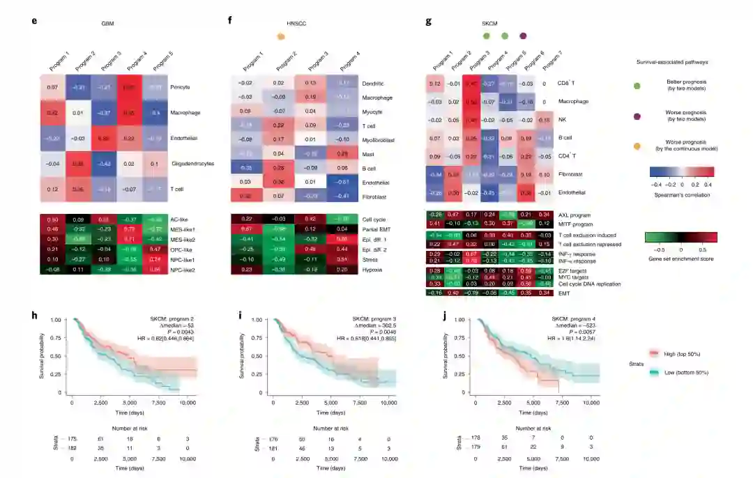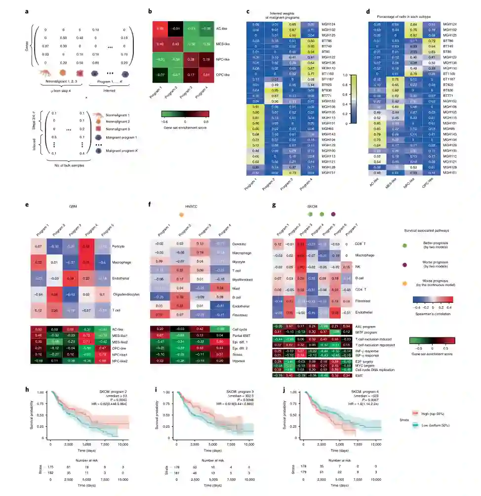 BayesPrism识别恶性细胞内在基因程序 作者在BayesPrism中开发了一个用于推断基因程序的线性组合的模块,在从非恶性细胞类型中分解出基因表达后,解释了bulk RNA-seq中的表达异质性(图4a),作者在由28GBMs读数聚集产生的伪bulk数据集上验证了该方法,BayesPrism恢复的基因程序与最近通过对同一数据集的6863个单一恶性细胞进行因子化得到的基因程序相似(图4b)。研究发现,基于BayesPrism学习的每个基因程序的权重与分配给四个主要亚型肿瘤中的细胞比例相关(图4c,d)。作者将嵌入学习应用于GBM、HNSCC和SKCM,揭示了GBM中与先前研究相似的几个程序,包括程序3(经典和AC类)、程序4(间充质)和程序5(前神经、OPC和NPC类)(图4e)。在HNSCC中,程序1因单细胞研究(图4f)确定的部分EMT程序而丰富,与存活率呈负相关(P=0.017,瓦尔德检验)。在SKCM中,作者确定了多个与AXL和MITF基因程序相关的生存相关基因程序(之前使用TCGA批量数据报告),以及一个T细胞排除程序(在最近的scRNA-seq研究中确定;图4g-j)。与基因集富集分析一致,BayesPrism没有发现任何与HNSCC中的间充质亚型或GBM中的神经亚型相似的基因程序。因此,作者认为,嵌入学习模块减少了非恶性细胞类型的影响,导致了恶性细胞固有的基因程序。