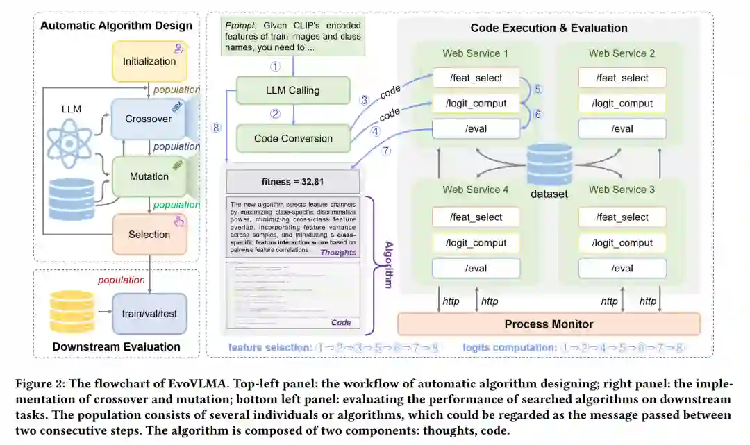预训练的视觉-语言模型(Vision-Language Models, VLMs)已被广泛应用于各类计算机视觉任务(如小样本识别),通常通过模型自适应技术(如 prompt tuning 和 adapter)来实现。然而,现有的自适应方法大多由人类专家设计,既耗时又依赖经验。受近期大语言模型(Large Language Models, LLMs)在代码生成方面进展的启发,我们提出了一种进化式视觉-语言模型自适应方法(Evolutionary Vision-Language Model Adaptation, EvoVLMA),用于自动搜索免训练的高效 VLM 自适应算法。 我们将特征选择与logits 计算识别为免训练 VLM 自适应中的关键功能模块,并提出了一种基于大语言模型辅助的两阶段进化算法,按序优化这两个部分。该方法通过“分而治之”的策略,有效应对了庞大搜索空间带来的挑战。 此外,为了提高搜索过程的稳定性与效率,我们引入了低精度代码转换、基于 Web 的代码执行机制和过程监控机制,共同构建出一个高效的自动算法设计系统。大量实验表明,EvoVLMA 所发现的算法在性能上优于以往的手工设计方法。例如,在 8-shot 图像分类设置下,经典的 APE 算法在识别准确率上可提升 1.91 个百分点。 本研究为预训练多模态模型的自适应算法优化自动化开辟了新的可能性。项目代码已开源,地址为: https://github.com/kding1225/EvoVLMA