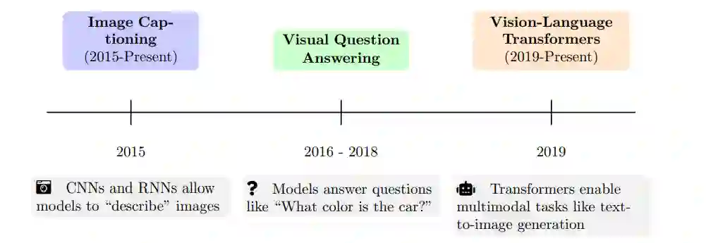 自然语言处理(NLP)和计算机视觉的融合彻底改变了AI的发展,催生了多模态大型语言模型(MLLMs)。这种融合使机器能够跨模态进行推理,从而对世界有更全面的理解。 关键历史里程碑: * 图像描述生成(2015至今):早期模型如“Show, Attend, and Tell”将卷积神经网络(CNN)用于图像分析,并结合循环神经网络(RNN)生成文本。这标志着机器能够“描述”它们“看到”的内容的开端。 * 视觉问答(VQA):这些任务要求模型结合视觉和文本输入生成有意义的答案。例如,模型可能被问到“汽车是什么颜色?”并看到一张红色汽车的图片。 * 视觉-语言Transformer(2019至今):诸如ViLBERT、CLIP和DALLE的模型展示了Transformer架构可以扩展到多模态应用。这些模型能够执行从文本描述生成图像或从文本查询找到相关图像等任务。
