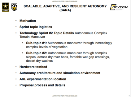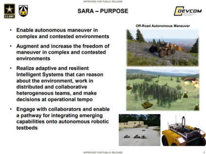 可扩展、自适应和弹性自主 (SARA) 协作研究联盟 (CRA) 专注于开发和实验加速自主移动性和可操作性、可扩展异构和协作行为以及人类智能体团队的新兴研究,以实现自适应和弹性智能系统可以对环境进行推理,在分布式和协作的异构团队中工作,并做出适时决策,以在复杂和有争议的环境中实现自主机动。