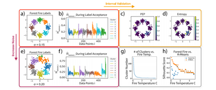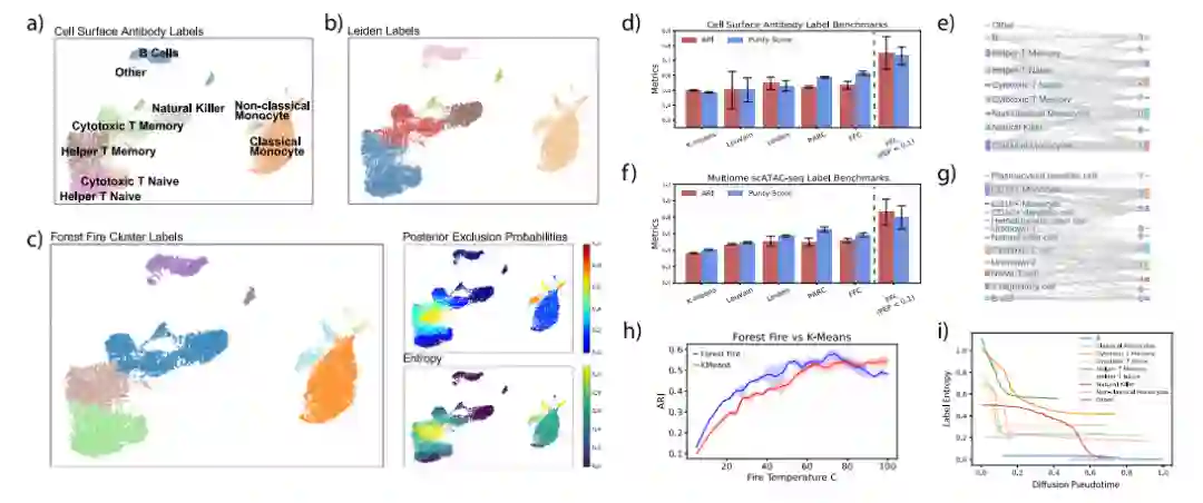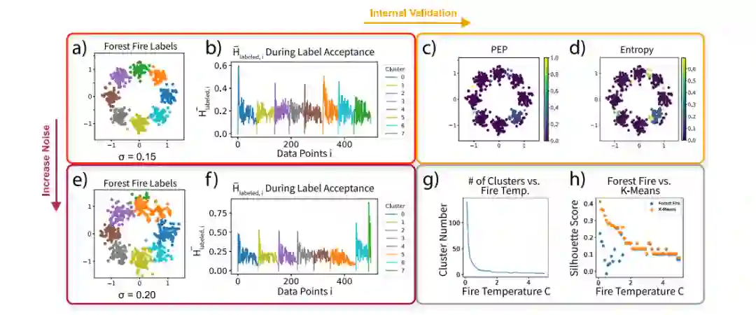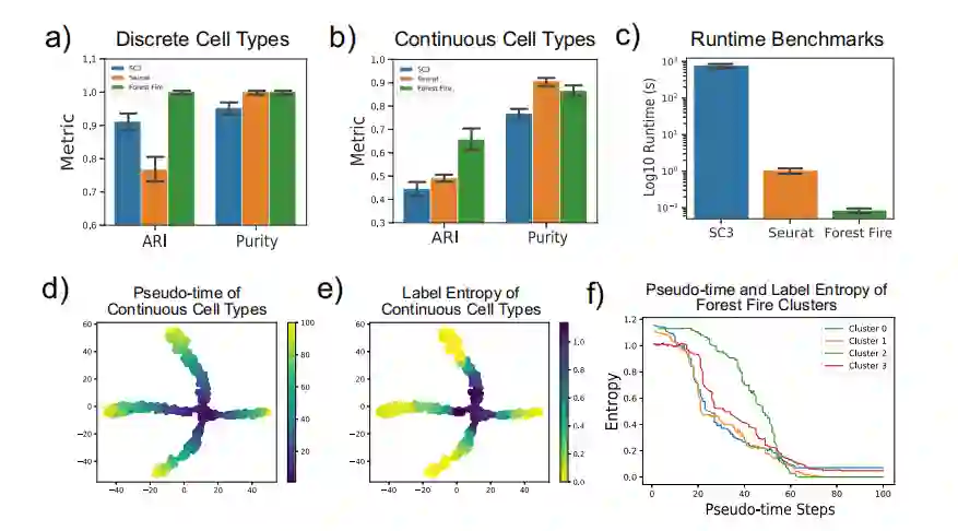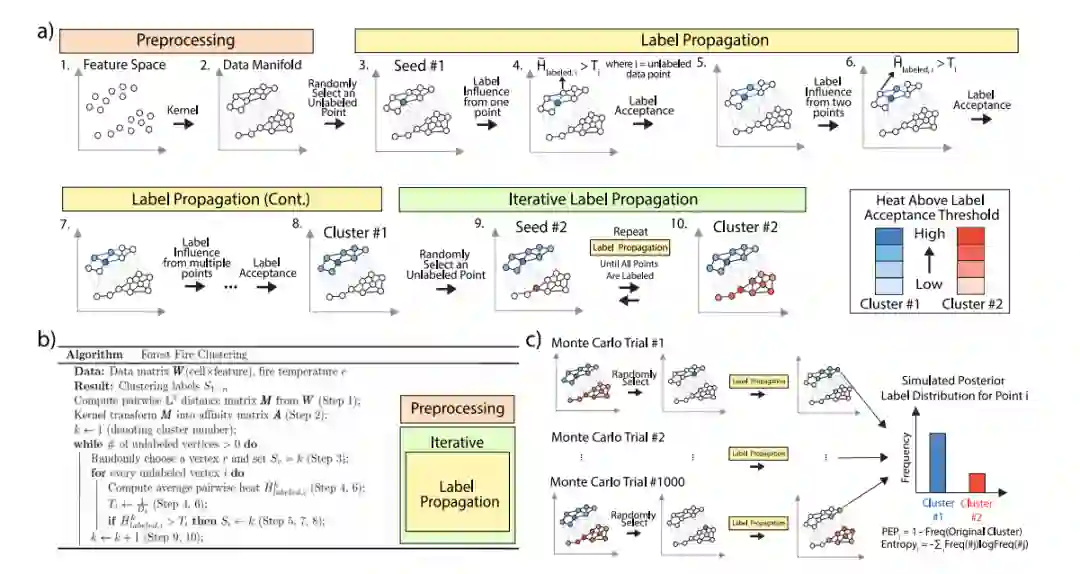 为了满足这些规范,作者根据森林火灾动力学中的自组织临界性开发了森林火灾聚类。通过模拟类似于森林火灾蔓延的标签传播,可以在仅给定一个“火灾温度”超参数的情况下(类似于Louvain中的分辨率超参数)对数据进行聚类。通过模拟来自不同起点的标签传播,可以计算与P值类似的逐点后验排除概率(PEP),以量化数据点在其他聚类标签上的概率。还可以计算逐点标签信息熵来测量每个数据点标签的一般不确定性。由于该算法的归纳性质,森林火灾聚类可以对少量新到达的数据点进行在线推断,而无需重新聚类。