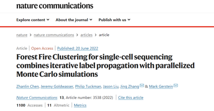 在这里,受森林火灾动力学的启发,作者开发了森林火灾聚类。森林火灾聚类在常见基准上优于以前的聚类方法,在scRNA-seq数据集上表现出稳健的性能。此外,森林火灾聚类可以使用蒙特卡洛模拟进行内部验证。聚类标签随机传播以产生逐点后验排除概率,该概率可以量化每个数据点的标签置信度,并用作质量控制的度量。此外,逐点标记熵可以突出发育伪时间的分支点和关键过渡细胞。 参考资料 Chen, Z., Goldwasser, J., Tuckman, P., Liu, J., Zhang, J., & Gerstein, M. (2022). Forest Fire Clustering for single-cell sequencing combines iterative label propagation with parallelized Monte Carlo simulations. Nature communications, 13(1), 1-13. Doi: https://doi.org/10.1038/s41467-022-31107-8