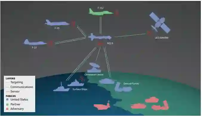 如图S.1所示,无人机系统将可能被整合到一个更广泛的战场网络中,包括第五代战斗机,如F-35s和F-22s;空中加油机,如KC-135s;远程轰炸机,如B-21s;巡洋舰和驱逐舰;卫星;航母打击群;陆基远征推进基地;指挥和控制中心;远程火力;以及其他平台和系统。