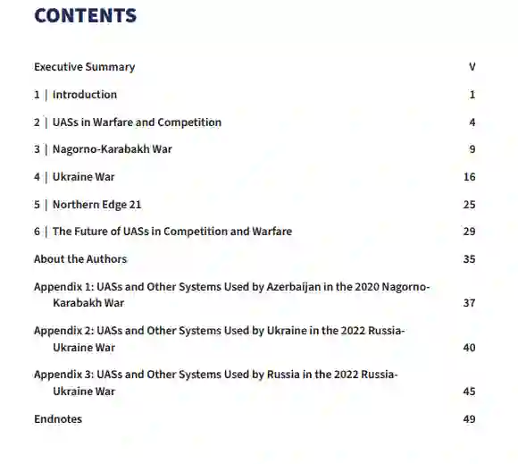 本报告的其余部分分为以下几章。第2章对无人机系统在竞争中的作用进行了评估。第3章研究了纳戈尔诺-卡拉巴赫战争中的无人机系统。第4章分析了俄罗斯和乌克兰在2022年的乌克兰战争中对UAS的使用。第5章探讨了NE21的教训。第6章对无人机系统在战争和竞争中的未来作用提出了政策含义。最后,附录1、2和3提供了案例研究中强调的阿塞拜疆、乌克兰和俄罗斯分别使用的无人机系统的概述--包括诸如类型、描述、范围、续航时间、原产国和制造商等信息。