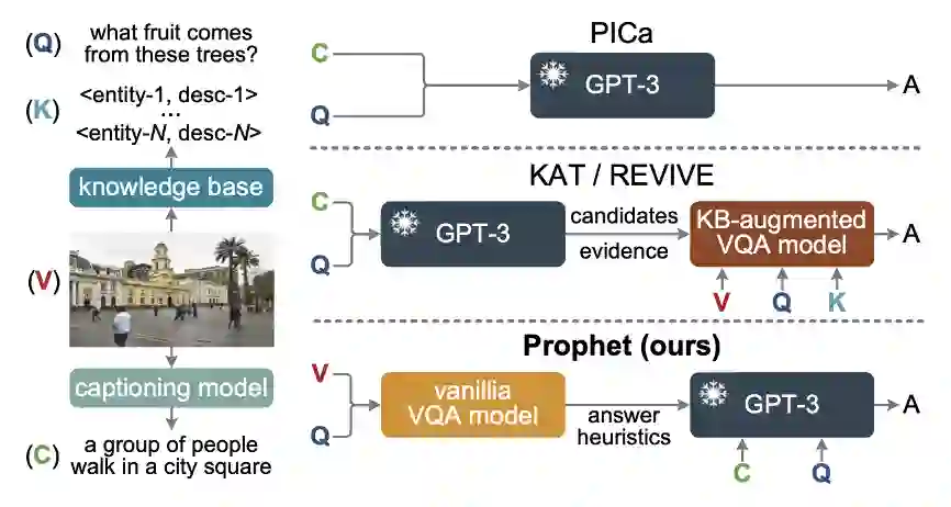 后续的工作 KAT [5] 和 REVIVE [6] 在 PICa 输出基础上,增加了一个基于显式知识检索的 VQA 模型,进一步提高了性能,但依然没有解决上述问题,未能充分挖掘出 GPT-3 的潜力。