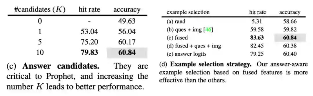 论文对 Prophet 方法进行了充分、细致的消融实验,上方两表展示了其中最重要的两个结果。在左表中我们尝试调节答案候选的数量,可以观察到该参数显著影响方法的最终性能,说明答案候选在 Prophet 方法中起着至关重要的作用。在右表中,我们尝试了其他策略来选择 prompt 中的示例,其中的 fused 一行即对应了我们基于潜在答案特征来搜索答案感知示例的方式,实验结果表明该方式是最优的。