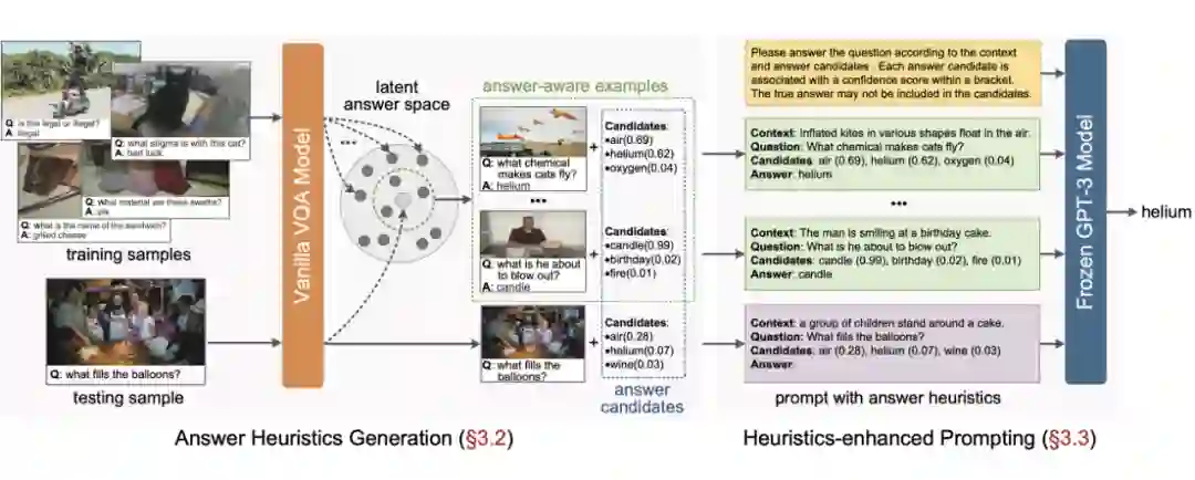 具体的,论文定义了两种答案启发: 1)答案候选(answer candidates): 问题的候选答案及其置信度;2)答案感知示例(answer-aware examples): 选择答案相近的标注样本(来自训练集)作为 prompt 中的例子。有趣的是,这两种答案启发可以使用同一个简单的 VQA 模型同时产生。