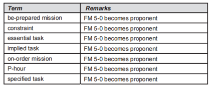 FM 5-0现在是几个术语的倡导者。(见FM 5-0术语的介绍表)。