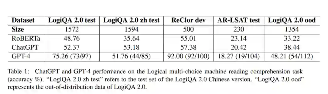 实验结果表明,ChatGPT和GPT-4在大多数逻辑推理基准测试上优于RoBERTa,包括流行的LogiQA和ReClor以及不太知名的AR-LSAT数据集。然而,对于两个GPT模型来说,分布外数据集的性能下降是明显的,这表明它们很难处理新的和不熟悉的数据。