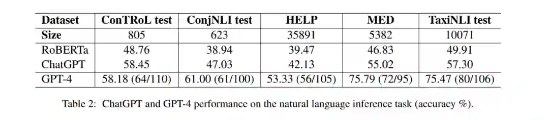 在自然语言推理任务上的实验结果表2展示了在自然语言推理数据集上的结果。在逻辑推理NLI数据集上,ChatGPT的性能优于RoBERTa模型。在对照测试集(805个实例)上,准确率达到58.45%,比RoBERTa-base模型高出近10%。在ConjNLI测试集(623个实例)上,ChatGPT的准确率为47.03%,比RoBERTa高出约9%。在HELP数据集(35891个实例)上,ChatGPT获得了42.31%的准确率,比RoBERTa高出约3个点。在MED数据集(5382个实例)上,ChatGPT的准确率为55.02%,比RoBERTa高出近9%。在TaxiNLI测试集(10071个实例)上,ChatGPT取得了57.30%的准确率,比RoBERTa算法提高了7%以上。由于我们注意到ChatGPT不擅长遵循NLI任务指令,因此我们提供了一个上下文示例来帮助模型生成任务标签,如图2所示。总的来说,结果表明,与在阅读理解任务上的表现相比,ChatGPT仅以很小的优势超过微调后的RoBERTa。