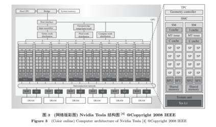GPU是专为图形(graphic)处理设计的专用处理器. 随着多媒体可视化需求的爆发, 传统的CPU是无法应对每秒动辄数百兆的视频渲染等任务. 高清图像、视频数据天然具备数据并行的特征, 可以通过高度的并行性来同时计算像素块中所有像素的色度、亮度等数据. 图3显示的是英伟达公司研发的经典Tesla架构的GPU, 之所以经典, 是因为从这一代架构开始, GPU 开始朝着通用GPU (即GPGPU)发展, 为后续GPU在深度学习领域的广泛应用奠定了基础.