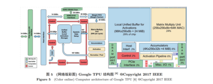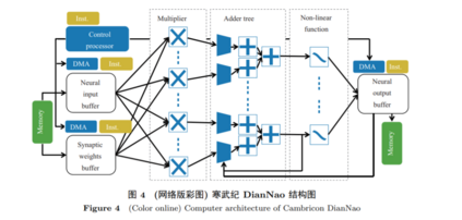 随着深度学习算法效果在图像处理中取得突破, 深度学习在越来越多的应用领域被应用. 在过去5年中, 用于处理深度学习的神经网络处理器(AI 芯片)快速发展, 其中比较成功的案例包括寒武纪的DianNao系列深度学习处理器[5] (图4)、Google的张量处理器TPU [6] (图5) 等. AI加速器大多针对机器学习中张量运算展开加速, 多基于SIMD方式实现, 单条指令通常可以完成一个矩阵的乘法运算, 因此也称为张量处理器. 除了张量处理之外, 还会伴有一些激活函数处理等非线性操作, 运算量相对较小, 实现起来也相对简单. 此类加速器重在张量处理, 控制相对简单, 通常不会集成通用处理核.