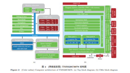 TI公司是DSP芯片的龙头, 被媒体评为是半导体行业利润率最高的公司. 2019财年营业总收入144亿美金, 税后净利润高达50亿美金, 利润率高达35%. 作为比较, 同期Intel收入720亿美金, 利润率29%; 英伟达总营收110亿美金, 利润率25%. TI公司的DSP主要分为3大系列: C2000系列, 集成了AD转换、Flash存储等, 主要用于控制马达、变频器等工控产品; C5000系列, 16 位定点, 主要用于便携声音、视频、机顶盒等设备; C6000系列, 采用了VLIW (very long instruction word)架构, 每秒执行指令峰值可达百亿条, 主要用于数字通信、图像增强、传输、加密解密等对性能要求更高的场景. 下面就以比较复杂的C6678为例做简要介绍, 其顶层架构如图2所示. 粗略观察DSP核其实与通常的RISC核没有太多区别, 如图2(b)所示: 都包括了取指令、指令分发、译码、寄存器读写、Load/Store、计算执行等环节, 但微体系结构有非常显著的特色. 例如, 普通采用超长指令字(VLIW)架构、突出的浮点处理能力、指令与数据分离等, 分析如下.