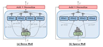 图2:密集激活的MoE层和稀疏激活的MoE层图示[8] 根据门控网络的激活方式,MoE可以大致分为两类,如图2所示: