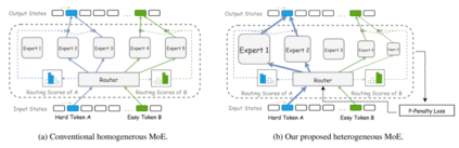 在传统的MoE模型中,所有专家都采用相同的结构和大小,降低了专家间的区分度与专家的专业化潜力。腾讯混元团队在2024年提出的混合异构专家模型[21]填补了异构专家设计的空白。如图4所示,该研究通过为专家分配差异化的隐藏层维度,构建了能自适应处理不同复杂度语言单元的专家系统,其中小规模专家专注常规特征处理,大规模专家应对复杂语义推理。为优化专家激活策略,他们还提出参数惩罚损失函数(P-Penalty),通过引入专家容量权重因子,有效抑制了训练过程中大专家过度激活的现象,促使模型在保证性能的前提下优先调用轻量级专家。