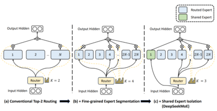 在传统路由策略中,分配给不同专家的token可能需要某些共有知识或信息,多个专家可能在各自的参数中不断学习共享知识,从而导致专家参数的冗余。因此,DeepSeekMoE[15]设置了专门用于捕获和整合不同上下文间共有知识的共享专家,令其他路由专家之间的参数冗余问题得到缓解。这种冗余的减少将有助于构建参数效率更高的模型,并增强专家群体的专业化。具体如图3所示,他们隔离了 个专家作为共享专家。无论路由的计算结果如何,每个token都会被确定性地分配给这些共享专家。