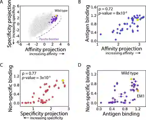 为了评估帕累托最优抗体变体的预测,团队接下来鉴定并产生了 41 个抗体突变体,这些突变体被预测为处于或接近帕累托边界(图 4A),并通过实验评估了它们的抗原水平(图 4B)和非特异性 (图 4C) 结合,结果表明模型预测对亲和力和特异性具有很强的预测能力。