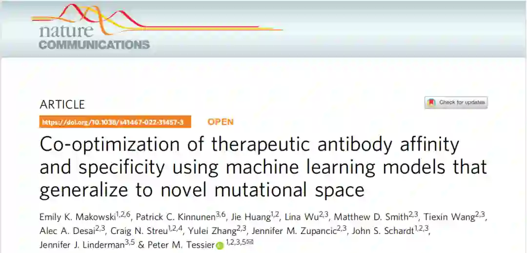 作者 | 杨千立 审稿 | 陈梓豪 指导 | 闵小平(厦门大学) 这次为大家分享的是来自nature communications上的一篇题为《Co-optimization of therapeutic antibody affinity and specificity using machine learning models that generalize to novel mutational space》的文章,来自密歇根大学生物界面研究所、生物医学工程系、化学工程系项目组的Peter M.Tessier团队。