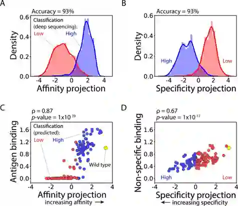 图3 (AB) (LDA) 模型使用基于序列的特征(one-hot 编码序列作为二元向量)进行训练,显示出对通过深度测序在富集文库中鉴定的 4000 种抗体的抗体亲和力和特异性进行分类的高精度。(CD) LDA 模型的连续预测,与随机选择的 125 种单链抗体 (Fabs)的相对亲和力( C )和非特异性结合( D )的实验测量密切相关。