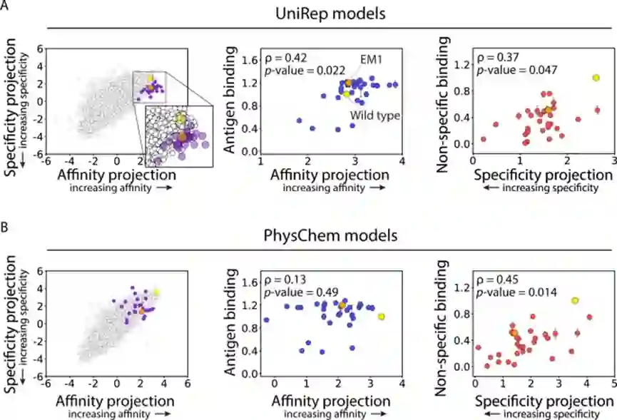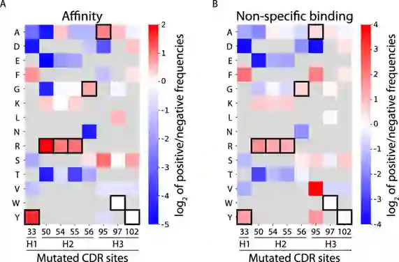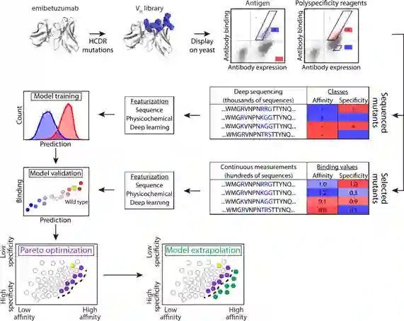 作者团队在该项工作中,以共同优化临床阶段抗体(emibetuzumab)的亲和力和特异性(非特异性结合)特征开发预测模型,该模型可以从大量但采样稀疏的抗体CDR库中学习,并预测未在原始库中采样的新CDR突变体的抗体特性,以识别罕见的共同优化变体。作者团队报告了一种综合实验和计算方法,结合深度测序、机器学习和高通量实验方法来识别共同优化的治疗性抗体变体,包括相对于亲本临床期抗体具有优越亲和力和非特异性结合组合的变体。