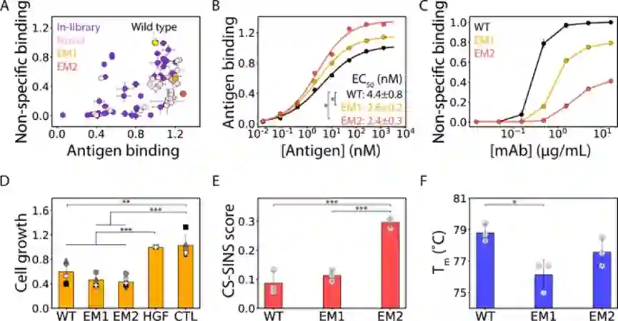 EM1和 EM2(一种变体)具有比野生型更高的亲和力(图 6B)。尽管这些变体的亲和力增加,但与野生型相比,它们都显示出非特异性结合减少(图 6C),这与使用卵清蛋白获得的类似非特异性结合测量结果一致(图 6A ),此外,EM1 和 EM2 在抑制肝细胞生长因子诱导的人类癌细胞增殖方面至少与野生型抗体一样有效(图 6D)总的来说,这些结果证明了使用机器学习来共同优化治疗性抗体以提高亲和力和特异性,同时保持高生物活性和其他类似药物的生物物理特性的巨大潜力。