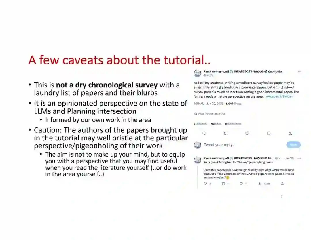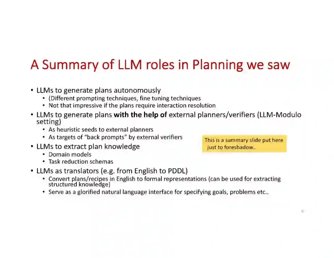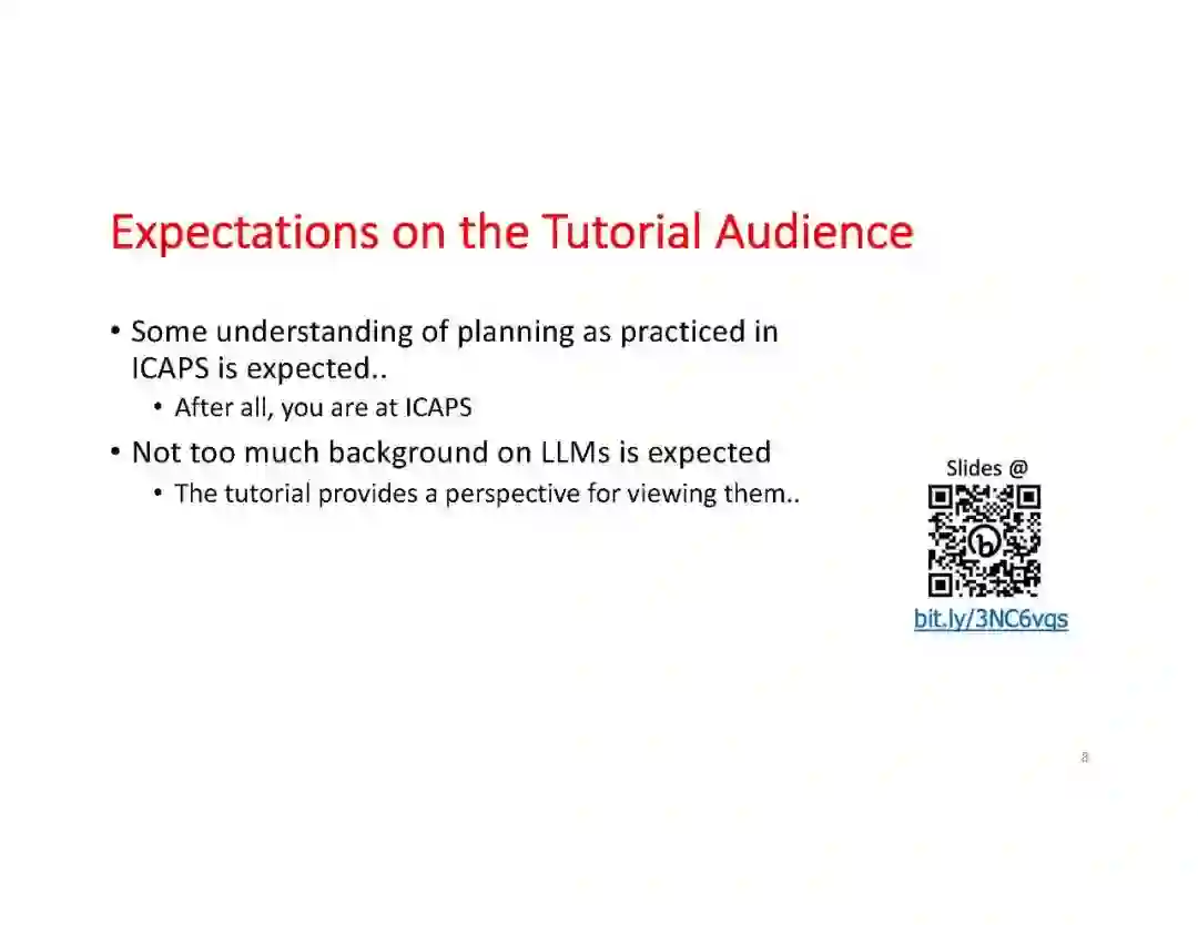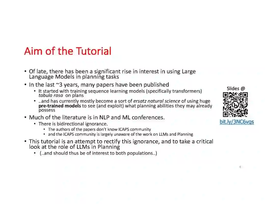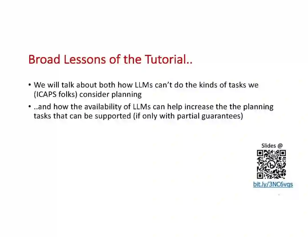本教程将指出LLMs在生成通常需要解决子目标交互的组合搜索的计划时的基本限制,并展示LLMs作为AI规划社区开发的健全规划者的补充技术的实际应用。除了介绍我们在这个领域的工作,我们还提供了许多相关工作的批判性调查,包括来自规划社区以外的研究者的工作。