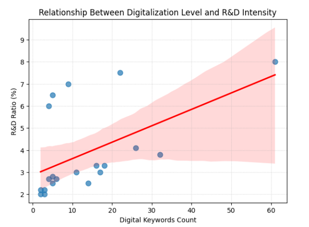 研究进行了普通最小二乘法回归分析和独立样本t检验,以分析以研发投资占比、协作强度和数字化参与水平为代表的创新活动在战前与战后的变化。结果表明,尽管平均研发占比在战后提升了约30%,但这一变化在短期内并不具有统计显著性。然而,定性证据和回归趋势表明,行业正逐渐转向数字技术和协作创新模式。大型国有企业的创新强度较低,而规模较小的私营公司则表现出更强的适应性和投资响应能力。