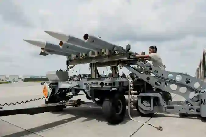 图:日本嘉手纳空军基地演习期间,美空军人员为F-15战斗机装载AIM-120 AMRAAM导弹。美国空军
