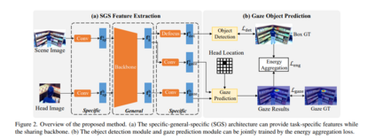 为此,论文提出了一个名为GaTector的新框架,以统一的方式解决凝视对象的预测问题。首先本文提出了一个特定-一般-特定(SGS)的特征提取器,利用一个共享的主干来提取场景和头部图像的一般特征。针对不同子网络的特殊性,SGS在共享主干之前引入了两个特定的输入处理层,在共享主干之后引入了三个不同的输出处理层。然后,本文设计了一个新颖的散焦结构,在不丢失信息且无需额外计算量的前提下为目标检测任务生成特定的物体特征。此外,框架引入了能量聚集损失,对不同的子网络完成联合优化。最后,本文提出了一个新的mDAP指标,即使不同边界框之间没有重叠的区域,它也可以揭示不同边界框之间的差异。此框架在GOO数据集上进行的大量实验验证了本文的方法在目标检测、视线估计和凝视物体预测三个任务中的优越性。