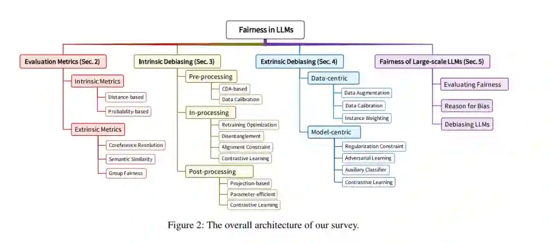 根据训练范式,LLMs可以分为预训练和微调范式,以及提示范式。在预训练和微调范式中,LLMs的参数少于十亿个,并且易于调整,例如BERT和RoBERTA(Liu等,2019年),我们称之为中等规模的LLMs。中等规模LLMs中的偏见可以大致分为两种类型:内在偏见和外在偏见(Goldfarb-Tarrant等,2021年),如图1所示。内在偏见对应于LLM编码的嵌入中的偏见,并反映了模型输出表示的公平性。外在偏见对应于下游任务的决策偏见,并反映了模型预测的公平性。在提示范式中,LLMs的参数超过十亿个,并且基于提示进行调整或不调整,例如GPT-4(OpenAI,2023年)和LLaMA-2(Touvron等,2023b年),我们称之为大规模的LLMs。大规模LLMs中的偏见通常在给定特定提示时体现在模型输出中。在本文中,我们对LLMs中的公平性相关研究进行了全面的回顾,总体架构如图2所示。重点关注预训练和微调范式下的中等规模LLMs,我们在第2节介绍了评估指标,在第3节和第4节分别介绍了内在去偏见方法和外在去偏见方法。在第5节中,提供了提示范式下大规模LLMs的公平性,包括公平性评估、偏见原因和去偏见方法。我们还在第6节中讨论了当前面临的挑战和未来发展方向。