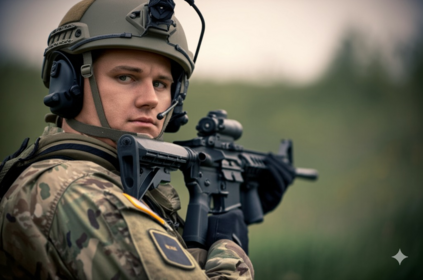 图示:配备先进通讯与听觉防护装备的士兵,可能集成AI声学检测技术