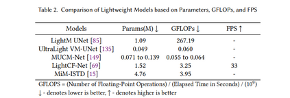 轻量化和高效模型设计旨在保持良好性能的前提下,使模型更小、速度更快且资源占用更少。表 2 基于每秒千亿次浮点运算(GFLOPs)、参数数量以及每秒帧数(FPS)比较了上述轻量化模型,这些指标分别对每个模型的计算效率、复杂性和速度进行了详细评估。 Liao 等人提出的轻量 Mamba UNet(LightM UNet)[85] 将 Mamba 与 UNet 架构相结合,形成轻量框架,以应对实际医疗环境中的计算挑战。该模型中提出的残差视觉 Mamba(RVM)层改进了 SSM,用纯 Mamba 方式从图像中提取深度语义特征。LightM-UNet 仅使用 1.09M 个参数和 267.19 GFLOPs,就能超越现有的最先进方法。Wu 等人引入了超轻量视觉 Mamba UNet(UltraLight VM-UNet)[135],这是一个轻量化视觉 Mamba 模型。通过并行视觉 Mamba(PVM)方法在保持处理通道数量恒定的同时,低计算复杂度下实现了高性能。PVM 主要由结合残差连接和调整因子的 Mamba 组成,使传统 Mamba 捕获远程空间关系而无需增加额外参数和计算复杂度。在三个公开皮肤病变数据集上进行的对比分析中,UltraLight VM-UNet 仅使用 0.049M 参数和 0.060 GFLOPs,即实现了有竞争力的性能。UltraLight VM-UNet 的参数数量比 LightM-UNet 减少了 87.84%。 Yuan 等人提出的 MUCM-Net [149] 是一个高效模型,将 Mamba 状态空间模型与 UCM-Net 架构结合,以改进分割和特征学习。该模型将 Mamba-UCM 优化为移动设备部署,提供高精度并具有最低的计算需求(约 0.055–0.064 GFLOPs 和 0.071–0.139M 参数)。Ji 等人提出的 LightCF-Net [69] 是一种新颖且高效的轻量化架构,作为一种实时息肉分割的远程上下文融合网络。该模型开发了新的 FAEncoder 模块,将大核注意力(LKA)与通道注意力机制结合,用于提取息肉的深度表示特征并揭示长程关系。此外,将新型视觉注意力 Mamba 模块(VAM)集成到跳跃连接中,以从编码器提取的特征中捕获广泛的上下文依赖关系,优先处理关键信息并通过注意力机制减轻背景噪声干扰。该模型在四个息肉分割数据集上的评估展示了其相对于领先轻量化息肉分割网络的运行效率和分割精度。尽管该方法在分割任务中表现良好,但医疗环境的复杂性和训练过程中标注数据的限制构成了挑战,使其难以完全满足医学应用的需求。该模型具有 1.52M 参数,运行于 3.25 GFLOPs,帧率为 33 FPS。 Chen 等人提出了用于红外小目标检测(ISTD)的 MiM-ISTD [15]。该模型利用 Mamba 有效捕获数据中的局部和全局信息,从而在低计算成本下保证更高的效率。在 NUAA-ISTD 和 IRSTD-1k 数据集上的实验中,MiM-ISTD 在准确性和效率方面均优于其他相关方法。MiM-ISTD 比当前最先进方法快十倍,在高分辨率图像测试中减少了 73.4% 的 GPU 内存使用。