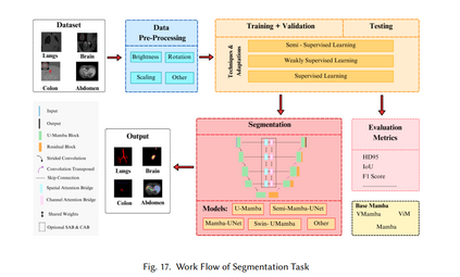 医学图像分割是一种用于识别和提取医学图像中特定感兴趣区域(ROI)的技术,如肿瘤、病变、组织或器官。其目标是将图像划分为具有相似特征的区域,包括颜色、纹理、亮度和对比度。表 3 概述了分割模型的参数、描述及代码的可用性。图 17 展示了 Mamba 基模型在医学图像分割任务中的工作流程。