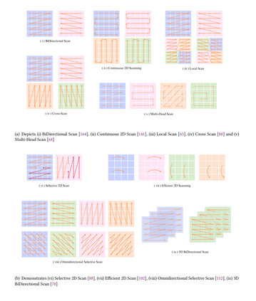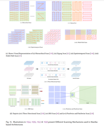 注意力机制,尤其是自注意力机制,具有平方级的时间复杂度,导致计算成本随序列长度呈平方增长。相比之下,扫描操作通常具有线性时间复杂度,因此在处理长序列时效率更高。扫描操作涉及计算一个数组(如前缀和),其中每个值由之前计算的值和当前输入决定。类似地,SSM 的递归形式可以视为一种扫描操作。扫描是 Mamba 的一个关键组件,特别是在处理多维输入时。Mamba 模型中扫描机制的选择至关重要,因为它提高了效率并提供了重要的信息。图 15 以可视化的形式展示了 Mamba 架构中采用的各种扫描机制,该可视化突显了集成到 Mamba 模型中的多种扫描方法的多样性。表 1 总结了各种扫描机制及其相关模型。