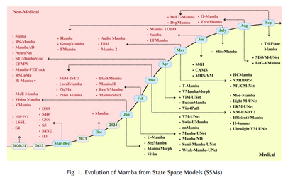 一些 CNN 的缺点通过 transformer 架构 [107, 124] 得到缓解,这类技术在序列数据处理和长程依赖方面表现更优。然而,transformer 也存在一些不足。主要问题是计算注意力的规模随着序列长度呈平方增长,因此在处理非常长的序列时会导致高昂的计算成本。此外,通常需要更多的资源和数据,这在资源受限的环境中(如医学领域)是一个难题。针对传统 CNN 和 transformer 的不足,许多研究探索了可以有效表示长序列及其复杂依赖关系的不同模型。近年来,状态空间模型(SSM)[47] 引起了广泛关注,Mamba [45] 模型便是其中之一。Mamba 旨在解决现代深度学习技术中的相关问题。它利用选择性状态空间来快速处理长序列,结合多种模式,并支持高效的分辨率和实用性。Mamba 的架构整合了选择性扫描机制和硬件感知算法,从而在中间结果的存储和计算方面实现高效率。这样使得 Mamba 在一些需要长程依赖和高复杂度的任务(如医学图像分割 [128, 134, 138]、分类 [44, 99, 150]、合成、配准和重建 [62, 83, 162])中表现优异。 Mamba 在生物医学领域表现出色,特别是在生物医学成像、基因组学和临床记录处理领域。因此,该模型在涉及长程和多模态数据的任务中表现出色,能够捕获信息单元之间的微妙关系和依赖性。图 1 展示了 Mamba 随时间演变的时间线,从 HiPPO [46] 和线性状态空间层(LSSL)[49]、S4 [47]、对角状态空间(DSS)[51]、S4D [48]、S5 [113]、S4ND [100]、Hungry Hungry Hippos(H3)[42] 到 Mamba [45]。其中还包括随着模型演进产生的 Mamba 变体。图 2 所示的饼图展示了使用 Mamba 框架在医学领域各项任务中的研究论文分布,分为五个部分,每个部分代表特定任务及其在总论文数中的比例。此外,图 3 展示了 2023 年 12 月至 2024 年 9 月期间 Mamba 在医学领域相关出版物数量的波动,研究活动在 2024 年 3 月和 4 月明显激增。 目前有几篇关于 Mamba 的综述性论文。然而,这些论文可能做了以下之一的选择——要么 [101, 104] 广泛覆盖框架,要么仅限于视觉领域的应用 [87, 140, 153]。值得注意的是,只有 [56] 对 Mamba 在医学领域的应用进行了评审。然而,我们的综述论文比 [56] 更为全面和详细。特别是,本文重点分析了医学数据集等公共资源,并提供了一些关于 Mamba 在医学实践中应用的实验数据,包括在医疗环境中 Mamba 可用的各种资源和干预措施。此外,我们还包括了 Mamba 架构在医学图像分析领域的最新研究和发展。我们以一种便于读者理解的结构组织了本文,帮助他们认识 Mamba 在医学领域的组织框架,包括其优势、劣势和前景。 在本综述中,我们关注医学领域内 Mamba 状态空间模型的使用、方法和问题。我们提供了该研究方向的现状概述,重点讨论了 Mamba 模型的优缺点及其未来前景。本文余下部分的结构如下:第 2 节讨论了与 SSM 相关的关键术语,第 3.1 节介绍了不同的 Mamba 架构。第 3.3 节讨论了若干 Mamba 优化,第 3.4 节解释了弱监督、半监督、自监督、对比学习和多模态学习等技术。第 3.2 节讨论了 Mamba 中的不同扫描机制,第 3.5 节介绍了各个领域中的应用。数据集概述见第 4 节。第 5 节讨论了展示 Mamba 在不同任务中表现的实验结果。第 6 节解释了 Mamba 的局限性和新兴领域,最后在第 7 节中提出了未来发展方向并总结了本文的研究。