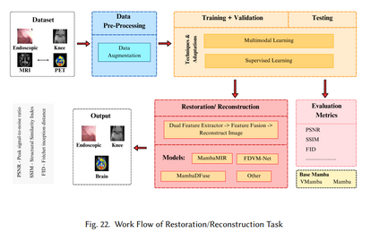 恢复(Restoration)是医学成像中的一种应用,用于改善因噪声、低分辨率和模糊等因素而受损或失真的图像质量。重建(Reconstruction)是一种将原始医学数据转换为目标图像的数学过程。表 5 概述了应用于医学图像恢复/重建的基于 Mamba 的模型,包括参数、描述及代码可用性。图 22 展示了基于 Mamba 的模型在医学图像恢复/重建任务中的工作流程。