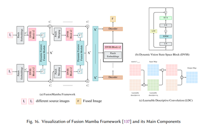 Xie 等人提出了类似 U-Net 的架构 Fusion Mamba [137],设计用于编码多模态图像并解码它们。Fusion Mamba 中的编码器部分集成了动态视觉状态空间(DVSS)模块,使用了高效状态空间模块(ESSM),包括高效二维选择性扫描(ES2D)和高效通道注意力(ECA)[129]。ECA 利用自适应平均池化和一维卷积层及 sigmoid 激活函数,使 SSM 有效学习通道表征。DVSS 输出通过可学习描述卷积(LDC)残差添加到输入上,允许 SSM 捕获每种模态中的纹理特征。动态特征融合模块(DFFM)用于在不同模态之间融合特征。DFFM 包含动态特征增强模块(DFEM),进行粗粒度融合,之后通过跨模态融合 Mamba 模块(CMFM)处理。解码器包含补丁扩展块和两个 DVSS 块,DFFM 的组合特征作为解码器的跳跃连接。最后,通过每种图像模态获得融合图像。 Zhou 等人提出的 MGI [163] 是一种用于对齐图像和基因模态的多模态方法,采用类似 CLIP [105] 的预训练方式。Mamba 编码器用于图像和基因数据,跨模态嵌入之间应用对比损失生成类似 CLIP 的矩阵。在注意力集成模块中,模块之间的对齐通过基因模态的自注意力块、基因到图像的注意力块、MLP 层及图像到基因的注意力块实现。 Fang 等人提出的 GFE-Mamba [39] 采用多阶段训练策略,首先训练 3D GAN 将 MRI 图像转换为 PET 图像,然后将 MRI 和 PET 的潜在表示与表格数据拼接,并通过线性层或嵌入层送入 Mamba 分类器。MRI 和 PET 潜在空间与 Mamba 表征之间的像素级双交叉注意力操作,进一步用于最终分类。