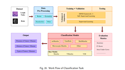 医学图像分类是指将图像分为不同类别,例如区分良性和恶性病变,或识别不同类型的疾病。图 20 展示了基于 Mamba 的模型在医学图像分类任务中的工作流程。表 4 总结了分类模型及其参数,附有描述和代码可用性的信息。