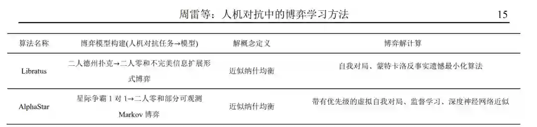 5 典型应用上一节阐述了人机对抗中的博弈学习研究框 架,本节将利用该框架对当前人机对抗智能技术领 域的重要工作进行分析(如表 2 所示),这些工作 基本涵盖了本文介绍的几种博弈模型,包括完美信 息扩展形式博弈(围棋)、不完美信息扩展形式博 弈(德州扑克)以及部分可观测 Markov 博弈(星 际争霸 2). 各工作的具体分析如下: