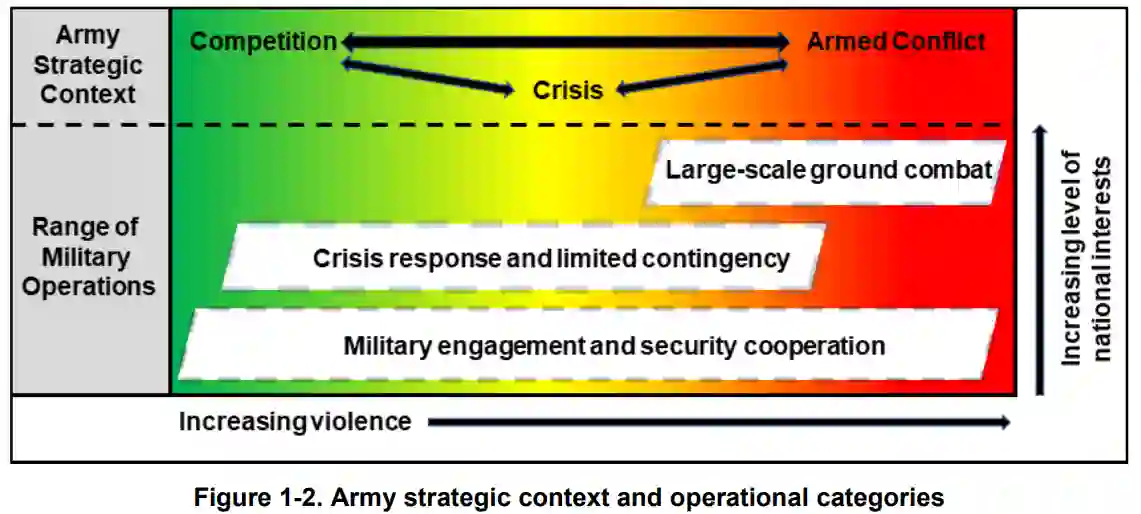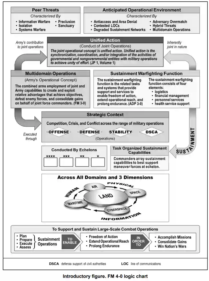 如果从上到下阅读下页引言图中的逻辑图,会更好理解。该图描述了预期采用的同级威胁和方法,以及预期作战环境的特点。逻辑图反映了统一行动的联合作战概念,并将多域作战定义为陆军的作战概念,以及持续作战功能如何为统一行动做出贡献。逻辑图显示了部队开展行动的战略背景,以及如何组织维持能力以支持所有领域的梯队作战部队。最后,图表描绘了大规模作战行动的持续性如何要求融入行动流程,以实现行动自由、扩大行动范围,并提供完成任务、巩固成果和赢得战争所需的持久耐力。