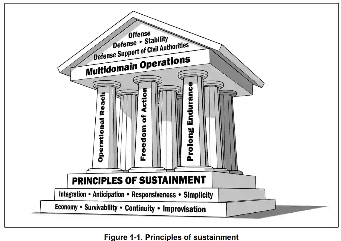 本手册讨论的条令与 FM 3-0 系列条令相互嵌套。持久性对行动的成功至关重要。陆军部队的耐力主要取决于其维持能力(ADP 3-0)。持续性决定了陆军行动的深度和持续时间。它对夺取、保持和利用主动权至关重要。维持本身就是联合行动,有助于联合部队指挥官实现行动自由、扩大作战范围和延长作战时间。在战争的各个层面,“持续”都必须与作战行动进行规划、整合和同步。持续能力取决于联合和战略整合,并应加以协调,以确保将资源交付到使用点。陆军的维持能力有助于提供关键的战区开辟功能,使联合部队能够实现战略和行动覆盖。陆军维持能力为其他军种、共同用户后勤和其他共同维持资源提供大部分陆军支持,以支持作战指挥官。