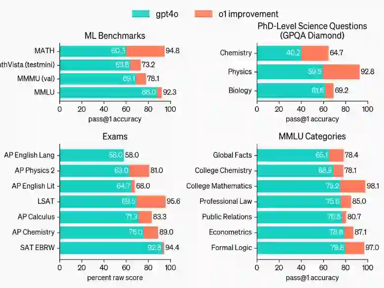 o1 在具有挑战性的推理基准上比 GPT-4o 有了很大的改进。