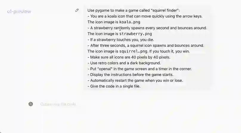 下面这个官方示例直观地展示了 o1-preview 的编程能力:一段提示词就让其写出了一个完整可运行的游戏。